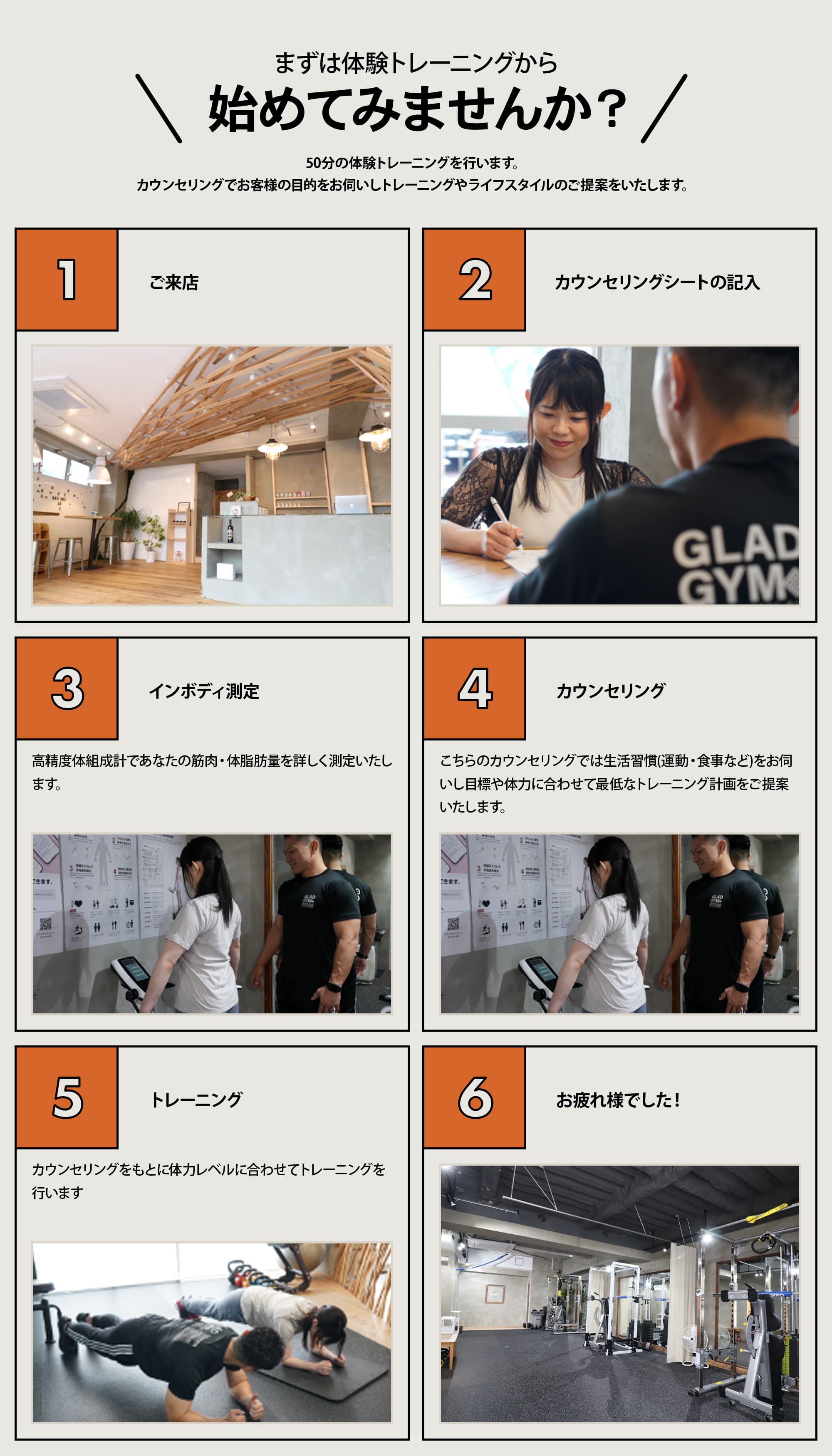 A:無料カウンセリング・体験トレーニングでお客様の生活習慣をお伺いし、あなたにあったダイエット計画をご提案致します!